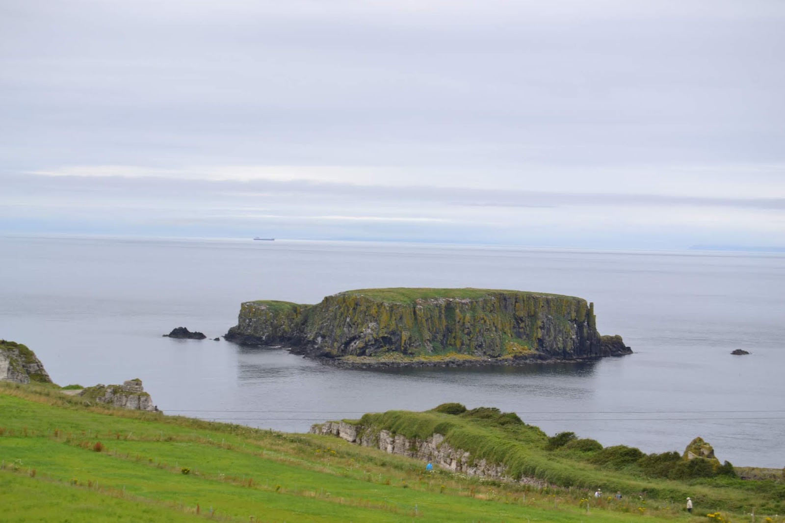campos onde a terra termina num penhasco, ligado a uma pequena ilha por uma